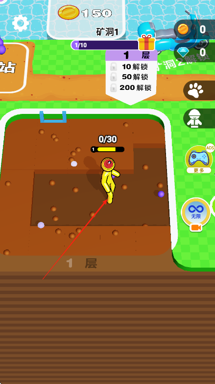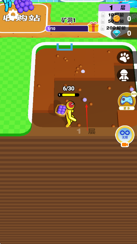 3、积累足够矿石达到每层要求数量,解锁新的层数,持续挖掘,同时利用金币钻石在收购站兑换道具和升级装备。
