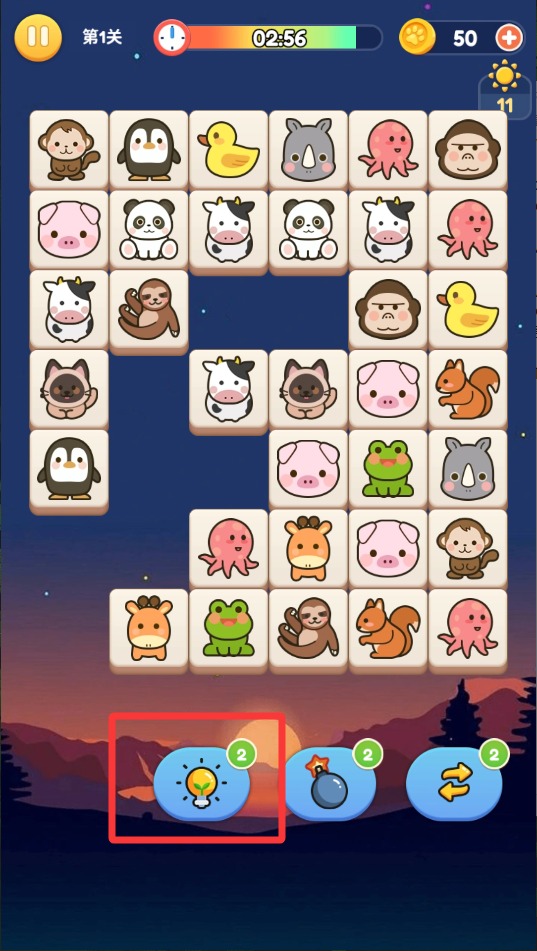 2、遇到找不到配对时点击右下角的提示道具,系统会自动显示一组可连接的方块帮助你继续推进。
