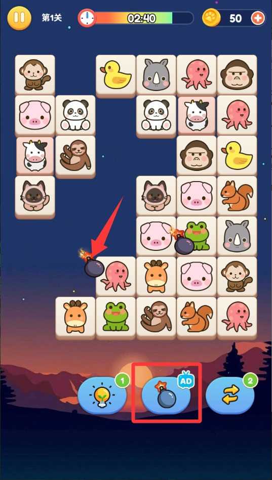 3、当剩余方块较少却难以配对时,使用炸弹道具能直接炸掉区域内所有障碍物快速打开局面。