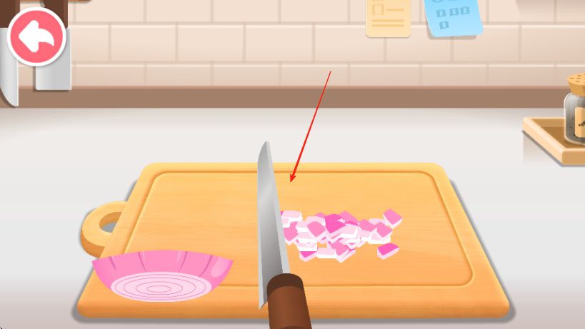 1、进入游戏厨房场景,点击刀具将食材如洋葱切碎,为烹饪做准备。