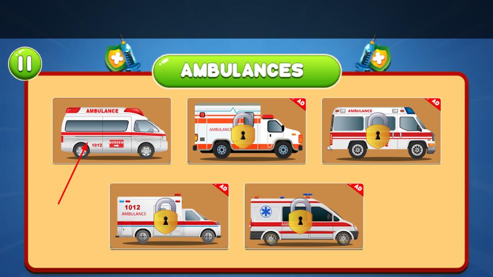 1、车库中点击解锁救护车首辆免费,其余需条件。