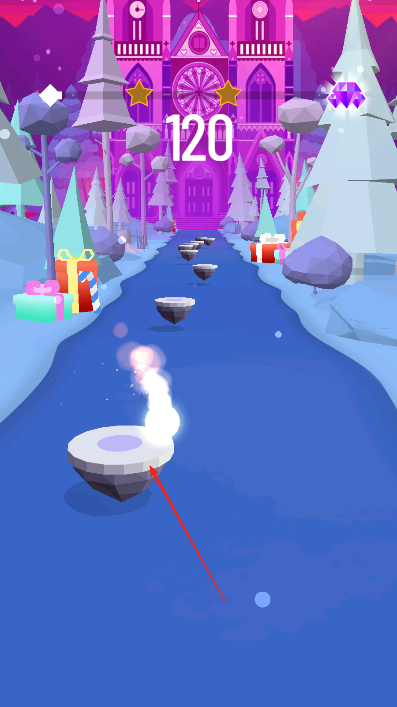 1、游戏开始,看到前方悬浮的平台,滑动屏幕控制小球跳跃,落到平台上,留意上方显示的分数120。