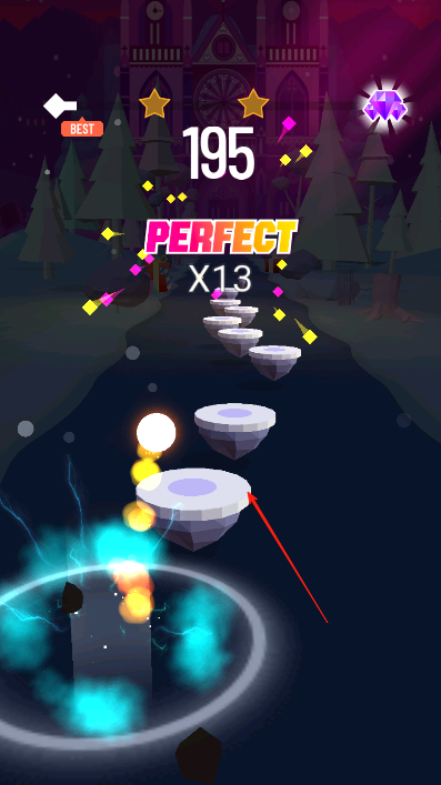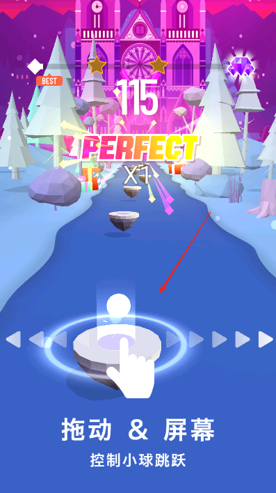 2、依据屏幕提示,拖动屏幕来精准控制小球跳跃时机和方向,尽量在平台出现的合适时机跳到上面,出现PERFECT判定可增加分数。