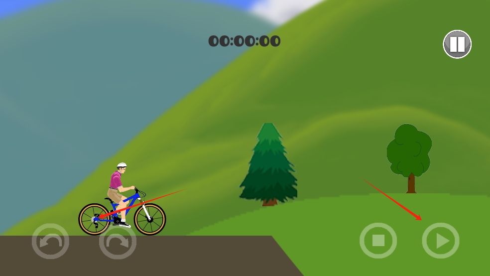 2、骑行中,依地形通过右侧按钮控制前进,遇坡及时调整,借绿色地形加速,避开颠簸,朝着终点前行。
