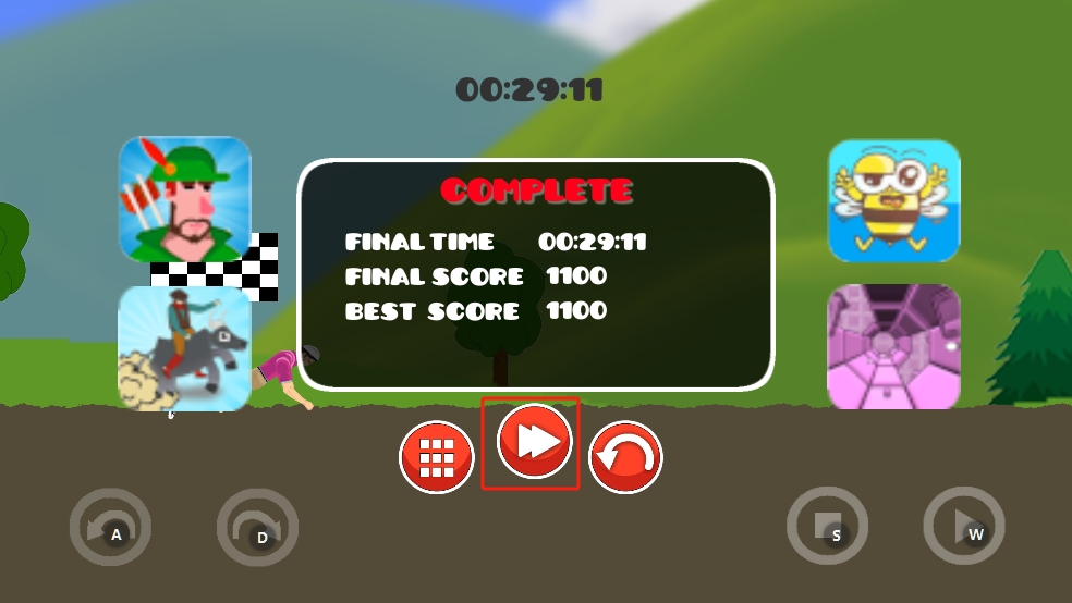 3、关卡完成后,界面呈现时间、分数,点击红框内箭头按钮,进入下一关,挑战更复杂骑行路线与地形。