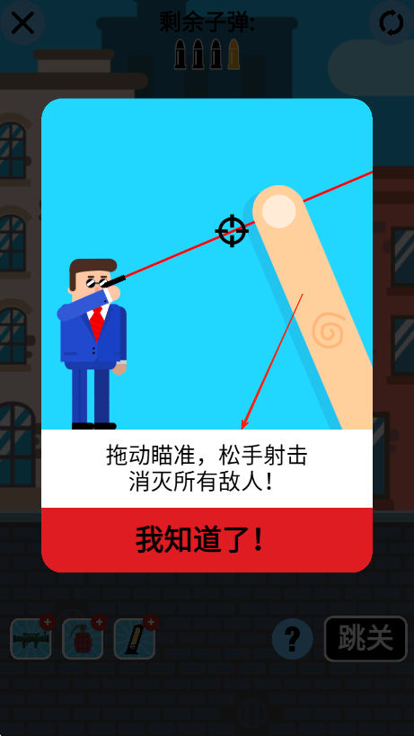 1、进入关卡,依照提示,用手指拖动屏幕瞄准敌人,注意剩余子弹数量。