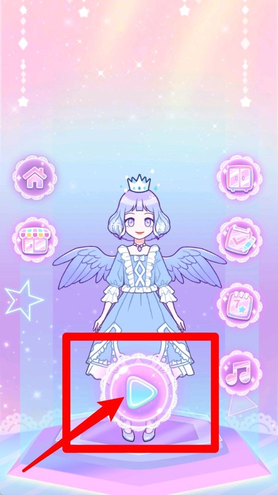 1.开始展示功能:点击中间播放按钮即可启动展示模式,角色在华丽舞台上呈现完整造型,正式开启时尚展示的全新体验。