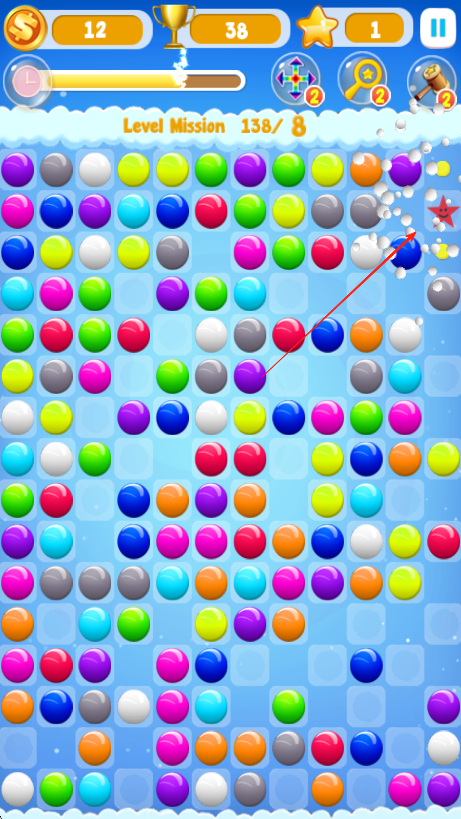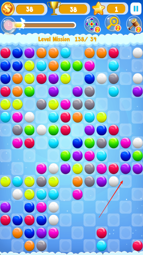 2、点击屏幕中能组成十字形状且颜色相同的4个球,即可触发消除,尽量制造更多消除机会。