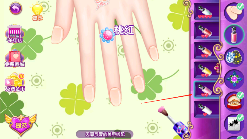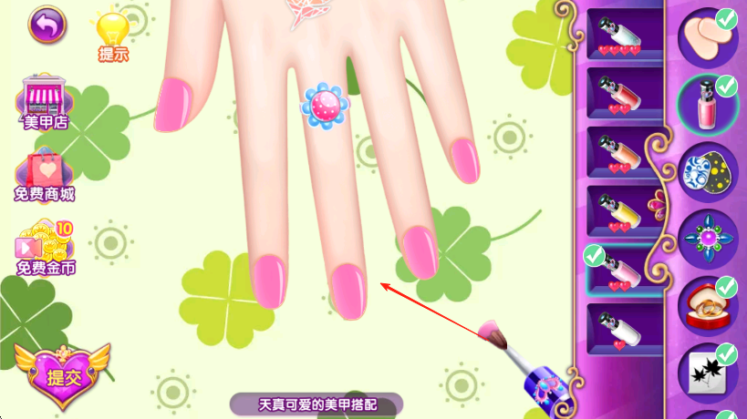 3、选中指甲油后涂抹在指甲上,完成涂色步骤,还可添加戒指等饰品,完成后点击提交。