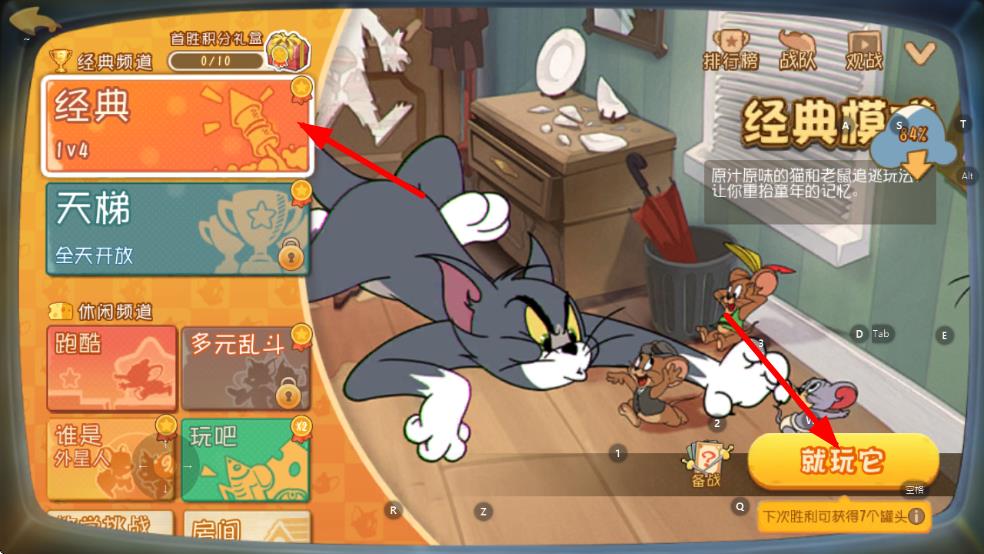 1、打开猫和老鼠游戏,点击主界面右下角开始游戏,进入游戏模式选择界面。