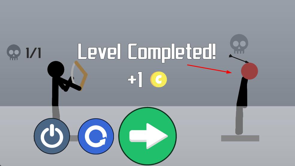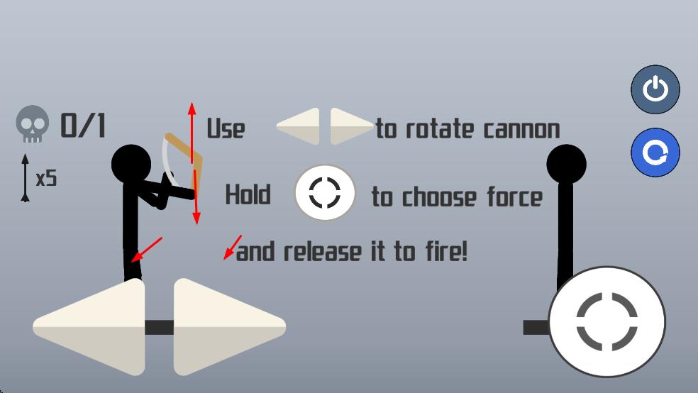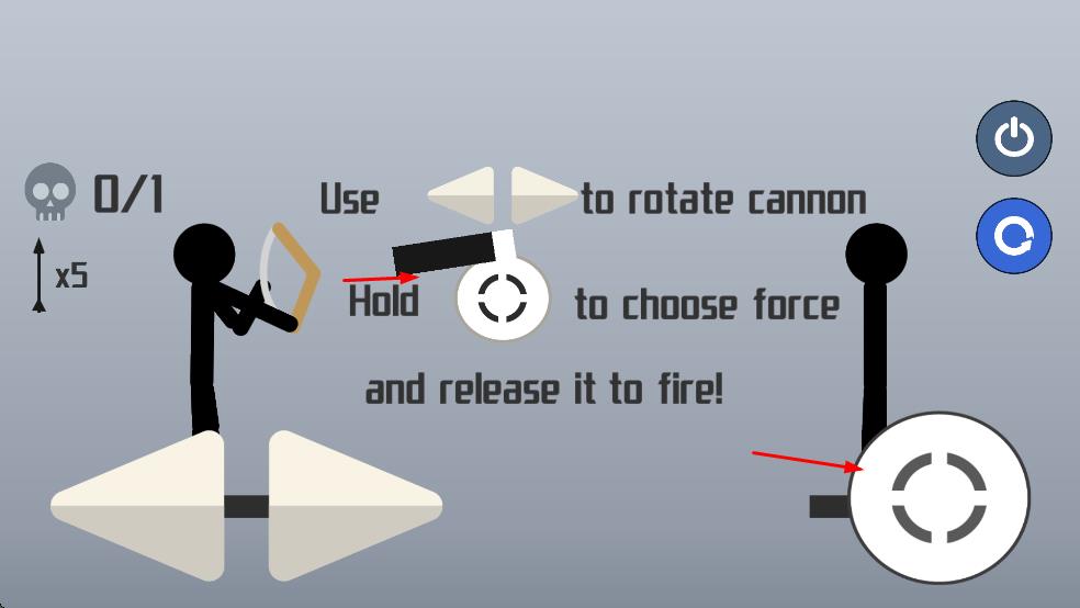 2、瞄准敌方火柴人,释放按钮发射弩箭,依左上角骷髅计数,规划射击消灭全部目标。