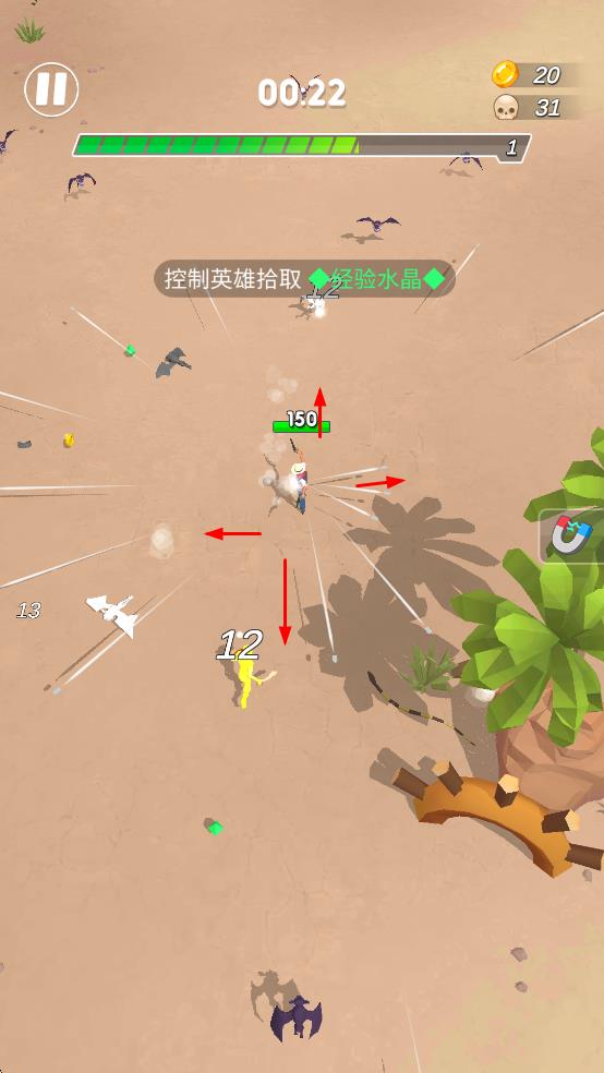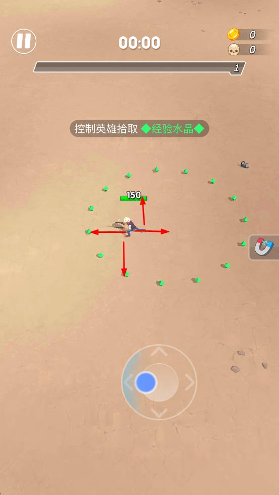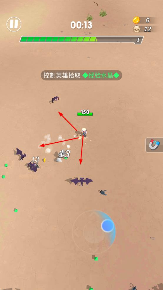 1、战斗操作控制英雄移动,自动攻击蝙蝠、小怪兽,拾取经验水晶提升等级、金币。