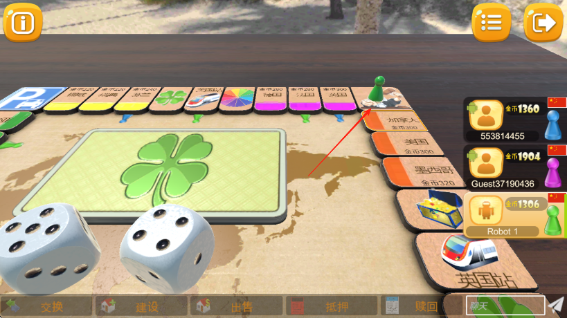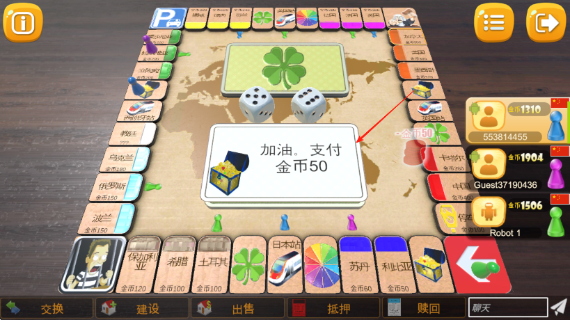 3、若走到其他玩家占领的格子,按提示支付金币,利用交换,建设等下方功能按钮,进行资产操作和策略布局,率先积累大量财富或达成特定条件获胜。