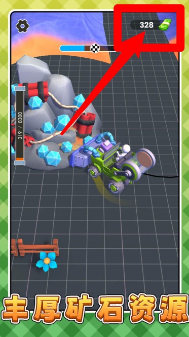 1.屏幕右上角显示当前金币数量,玩家通过采集矿石或宝藏获得金币,积累后可用于升级设备,提升挖掘机整体性能与效率。