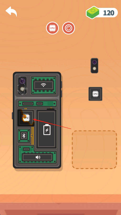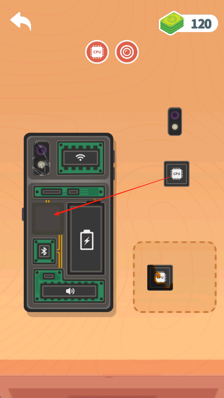 2、观察手机主板上的空位,点击并拖动对应零件,如【CPU】芯片,放置到主板相应位置。