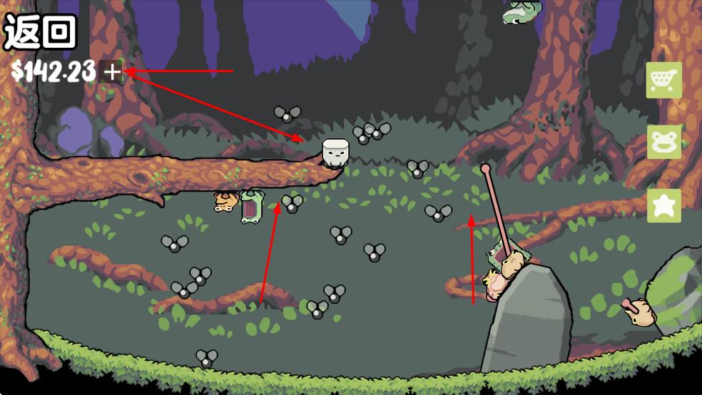 1、在森林场景操控青蛙捕食飞虫,积累金钱,观察角色互动,推进收益积累。