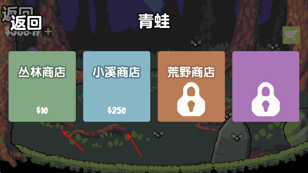 3、商店界面花费货币,解锁丛林、小溪商店,拓展青蛙获取渠道。