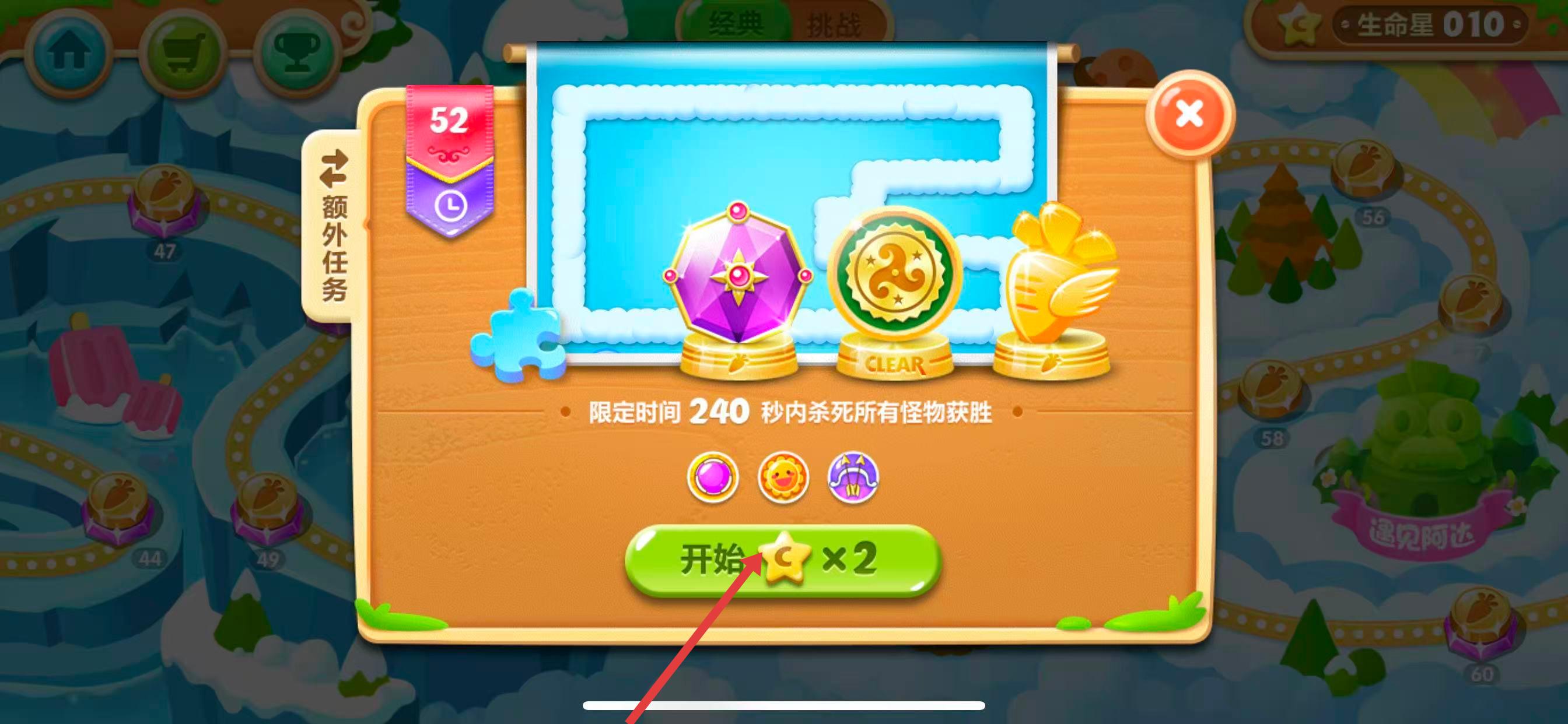 2、在关卡详情页,确认限定240秒内杀死所有怪物的胜利条件,点击开始按钮,消耗2颗星星进入第52关游戏界面。