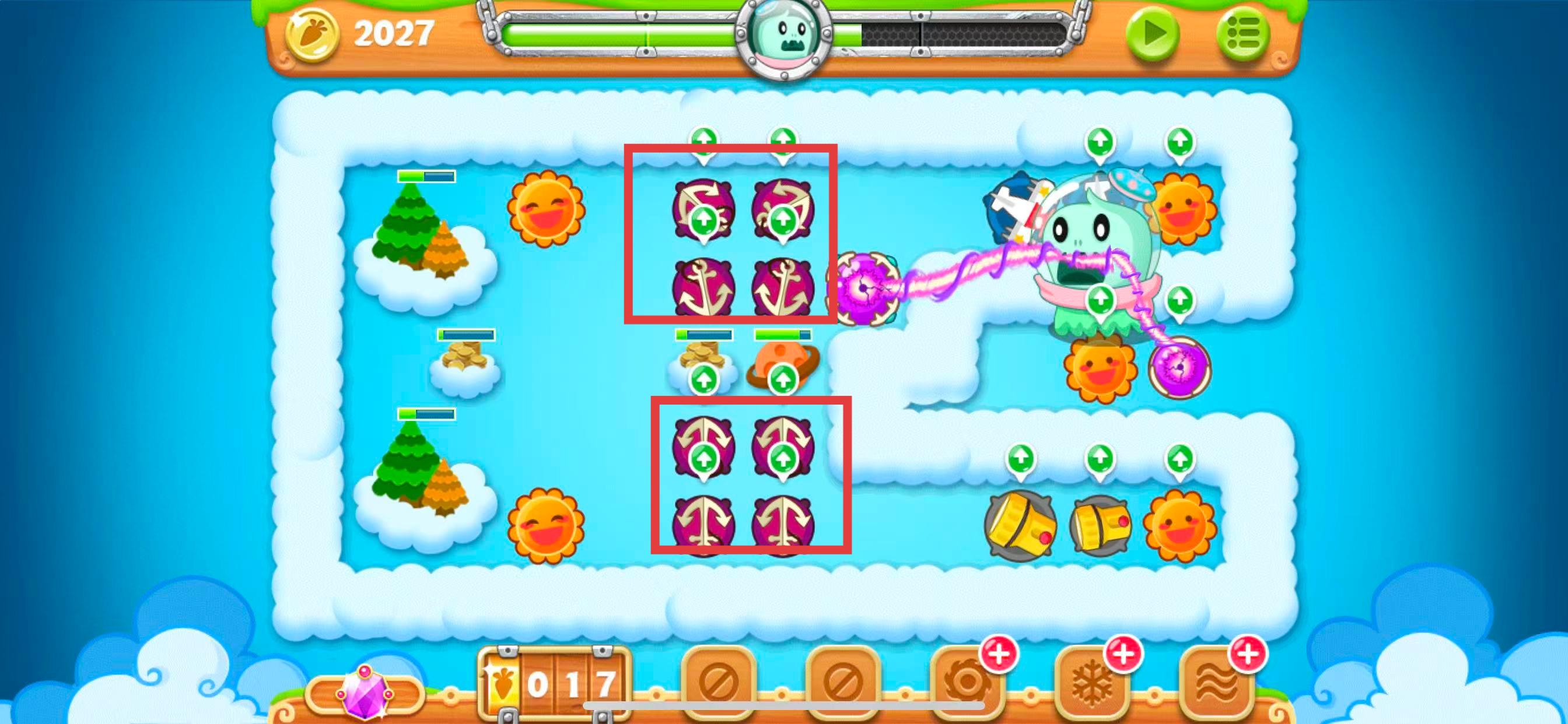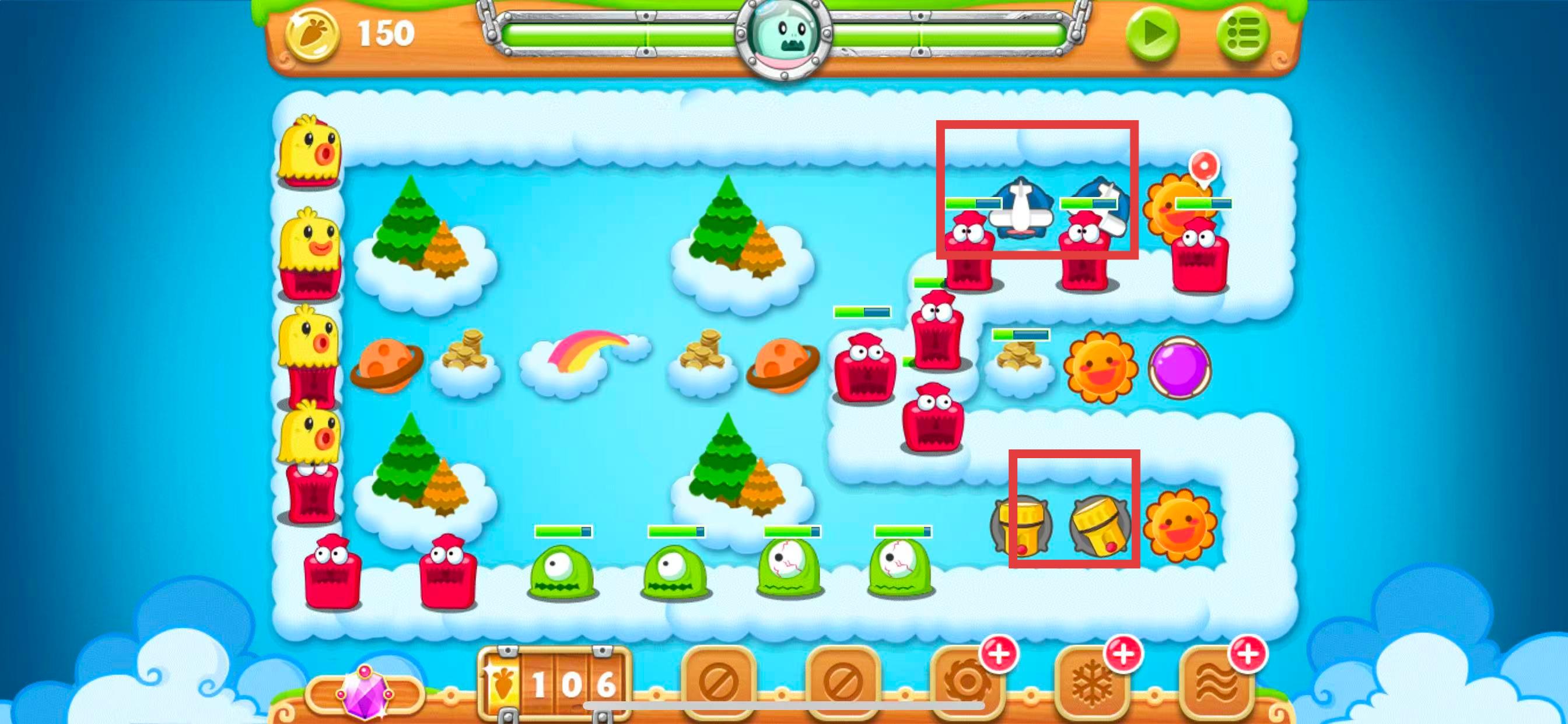 3、进入游戏后,优先攻击标记的位置,打出飞机和手电筒的炮塔,推动消灭怪物进程。