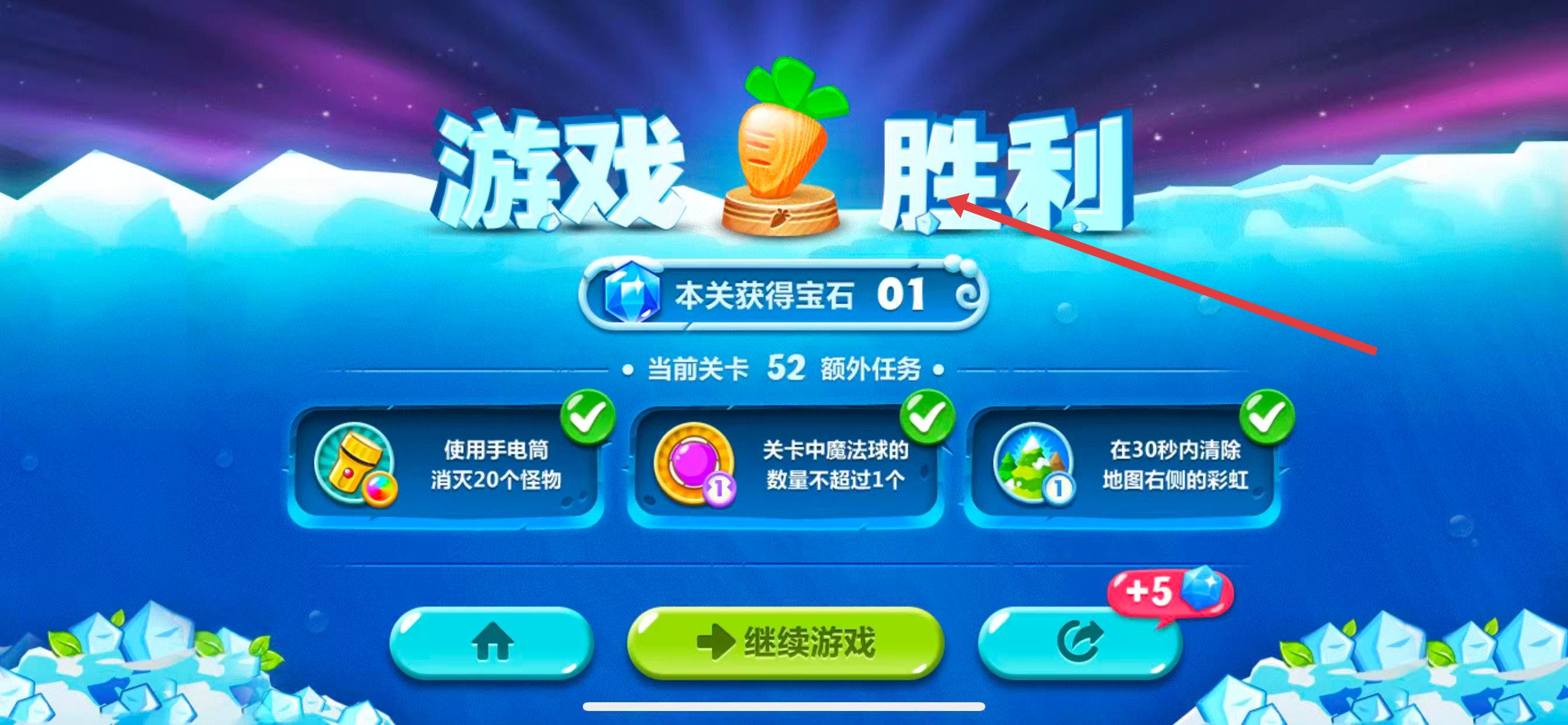 5、达成胜利条件后,界面显示游戏胜利,可查看本关获得宝石及额外任务完成情况,成功通过52关。
