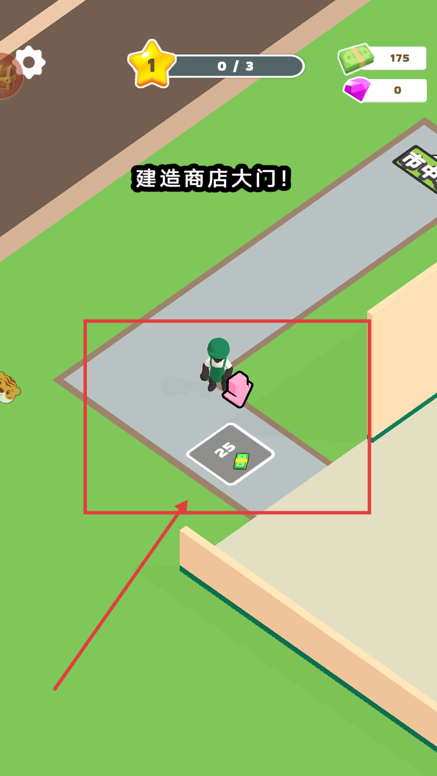 1、接【建造商店大门】任务,点击角色旁【25资源标识】,消耗资金启动大门建造,推进星级目标。