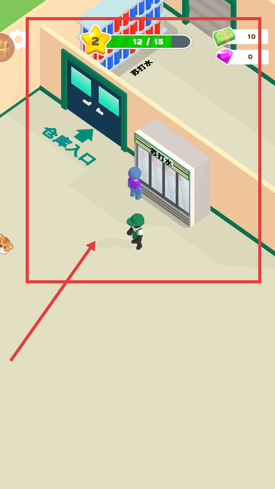 3、建成【苏打水区域】【仓库入口】,引导顾客互动,推动【12/15,进度条】,积累商店经营成果。