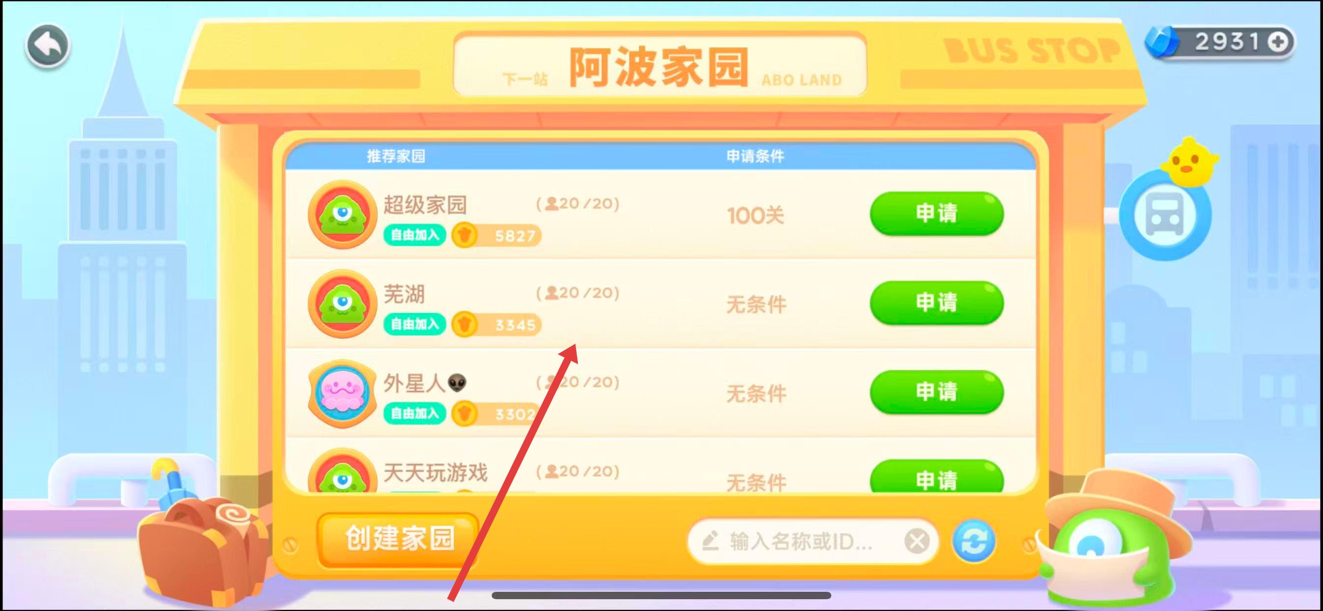 2、在阿波家园界面,浏览推荐的家园列表,查看各家园的名称、成员数量、加入条件等信息。