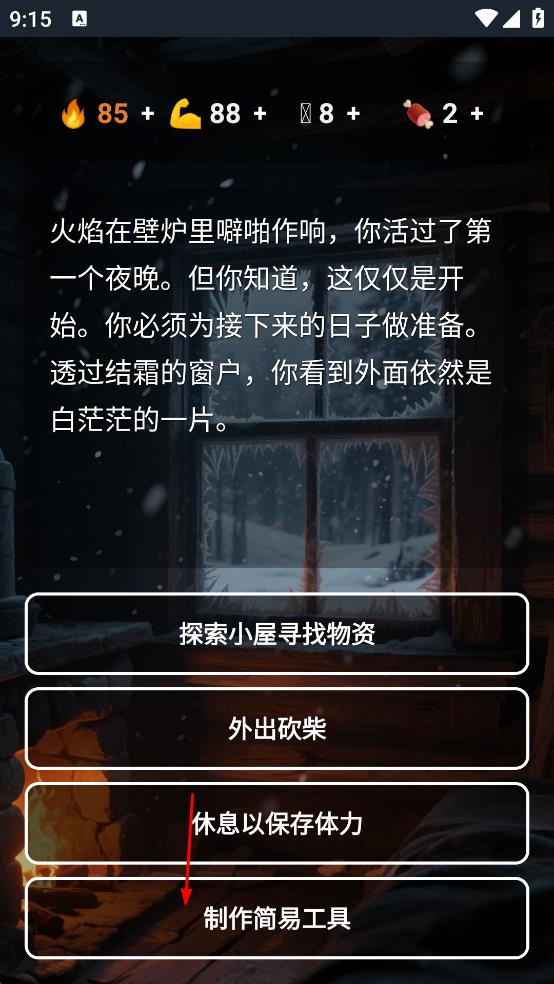 2、选择即时影响生存走向:每一次决策都即时反馈在生存状态上,选择冒雪外出可能找到食物却冻伤体温,选择留屋休息虽节省体力却可能耗尽木柴。