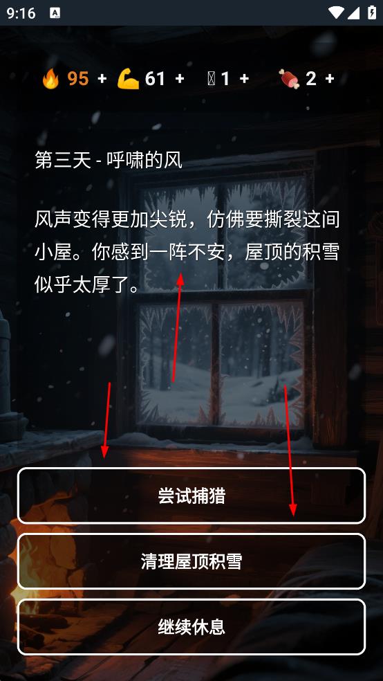 3、第三天风雪加剧,从尝试捕猎,清理屋顶积雪,继续休息中决策,应对环境危机。