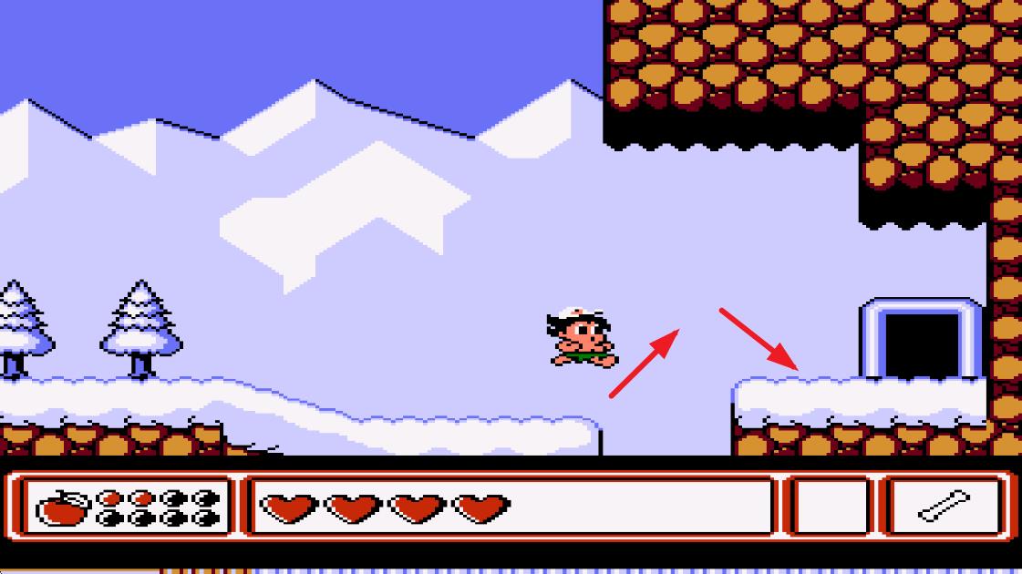 2、雪地场景里,把握跳跃时机跨越沟壑,朝【门口】方向前进,留意体力避免坠落受阻。
