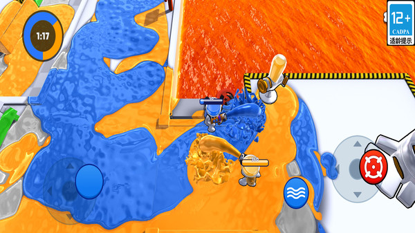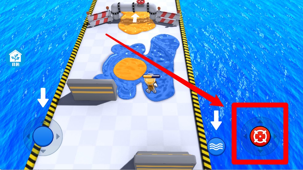 2.点击右下角的红色瞄准按钮即可发射水枪,颜料喷射攻击能覆盖地面区域,帮助压制敌人并逐步占领战斗空间。