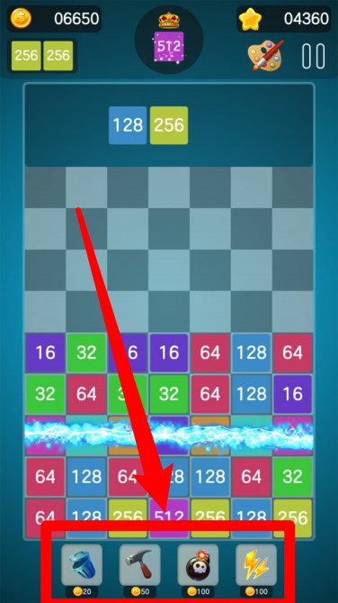 2.关卡中玩家需不断将数字方块合成,底部提供锤子炸弹等道具,灵活使用能帮助清理方块或创造更高分数。