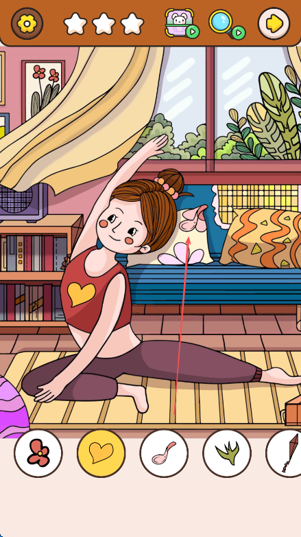 1、进入关卡,观察场景里沙发抱枕、书架等细节,依据下方道具图标找对应物品,点击沙发上的蝴蝶样式物品。