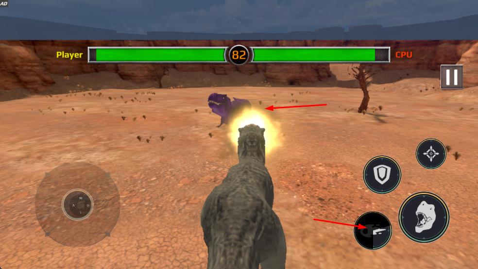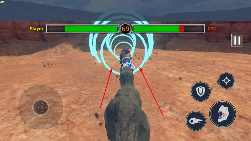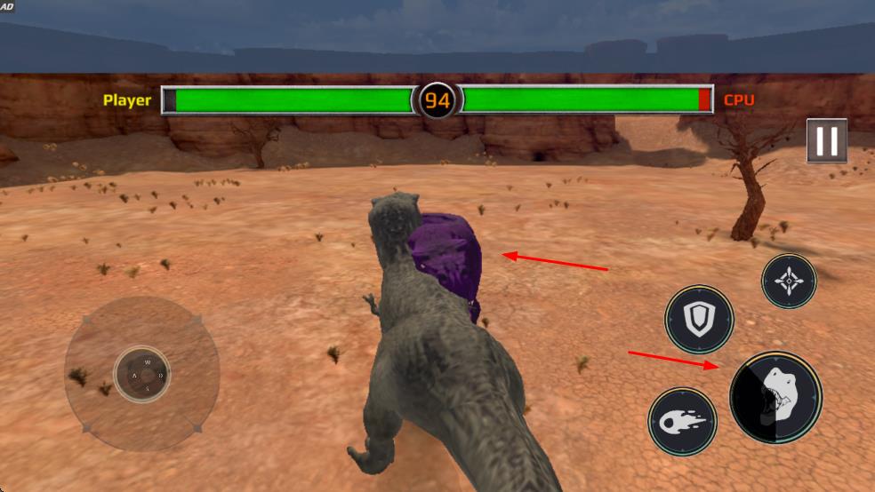 1. 左虚拟摇杆操控恐龙移动,锁定敌方恐龙如紫色恐龙,发起进攻。