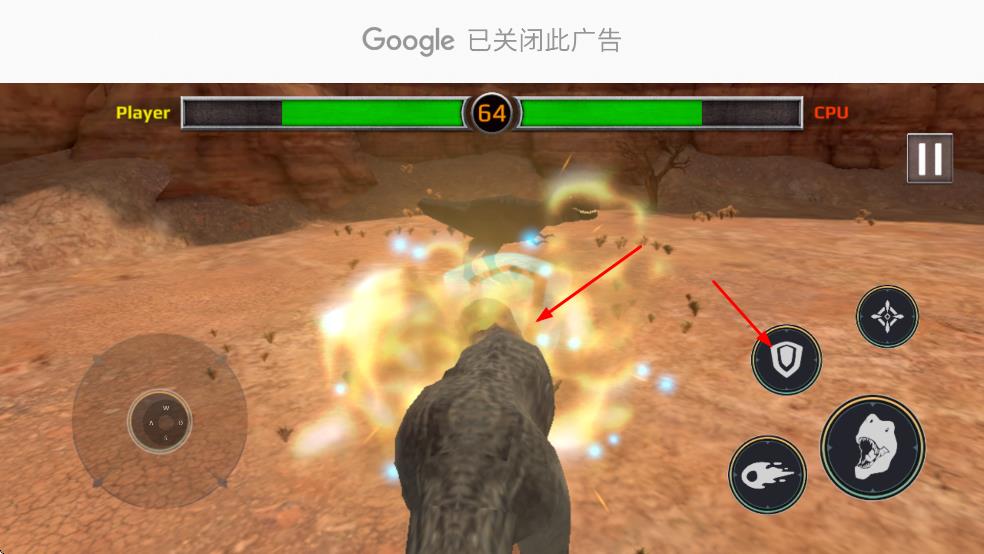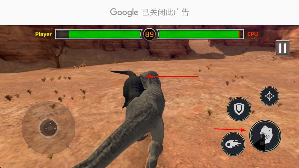 2、左虚拟摇杆操控恐龙移动,右侧按键释放技能攻击、防御、特殊技,与敌方恐龙战斗。