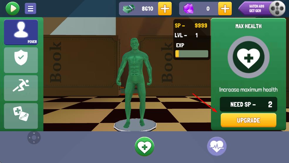 2、进入属性界面,消耗SP点击UPGRADE,升级生命值等属性,强化角色。