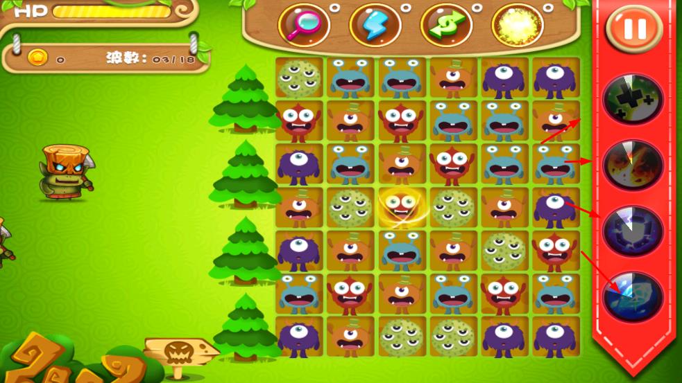 1、交换相同怪物方块消除,产生能量对敌方造成伤害,推进波数目标进度。