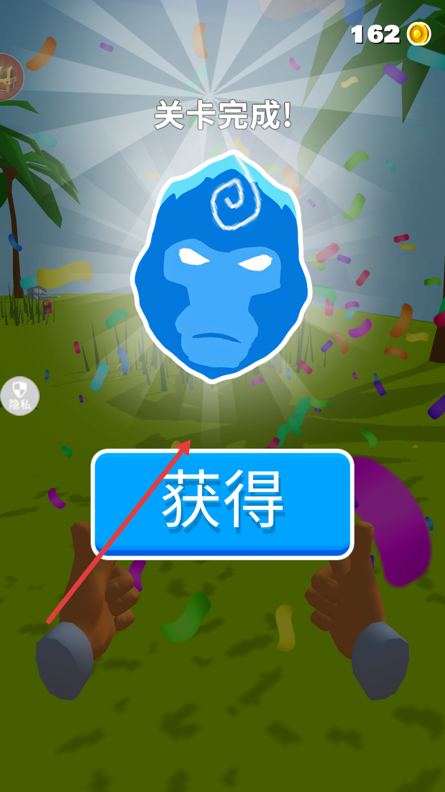 3、关卡完成后点击【获得】按钮,领取【162】金币奖励,解锁新内容。