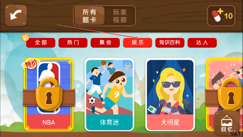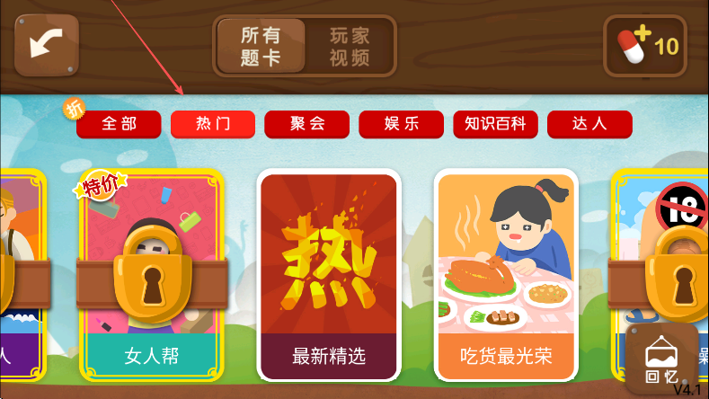 2、在题卡选择页面上方、能看到全部,热门,聚会等不同类型标签、点击标签筛选。