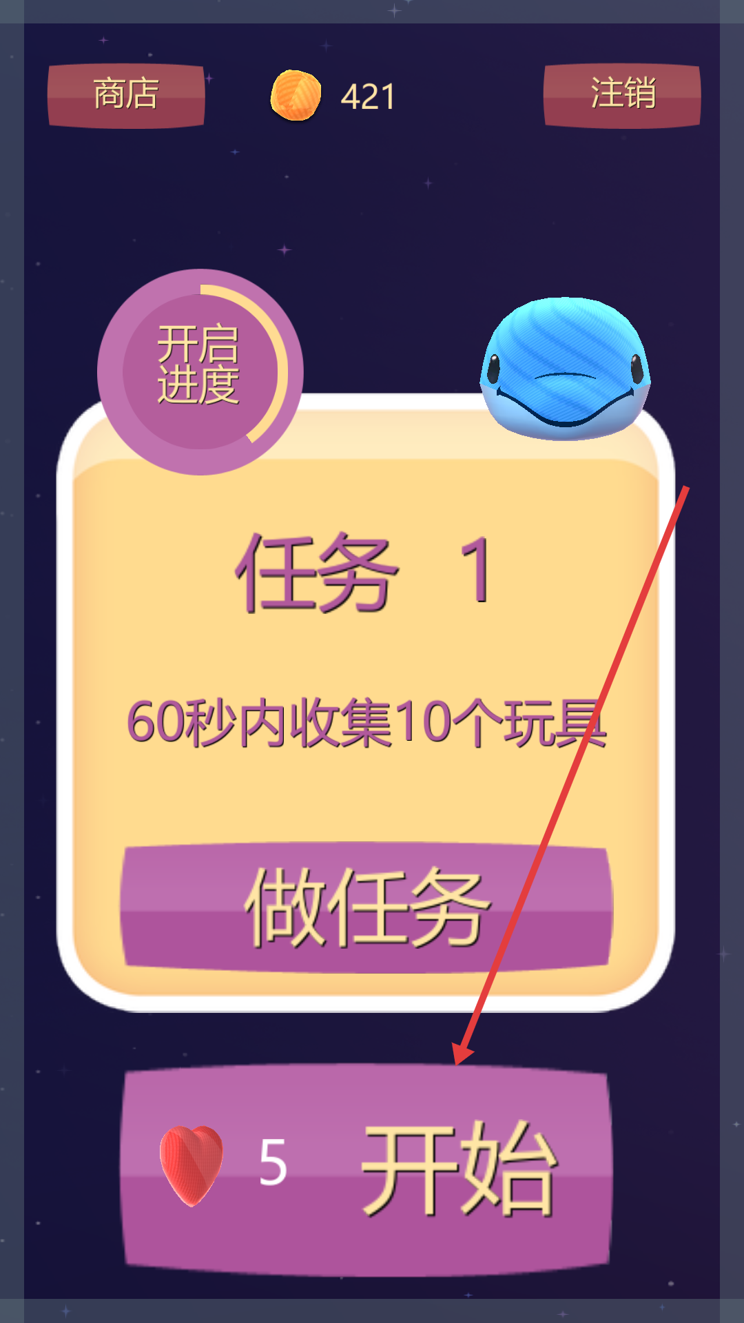1、任务页点开始,消耗5爱心,进入60秒内收集10个玩具关卡。