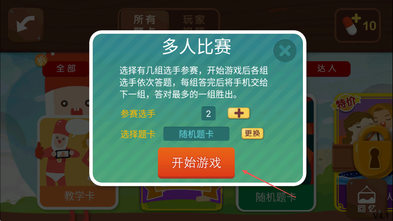 1、进入游戏点击多人比赛、在弹窗中设置参赛选手组数、选择选择题卡类型后点击开始游戏。