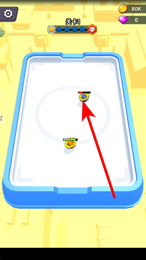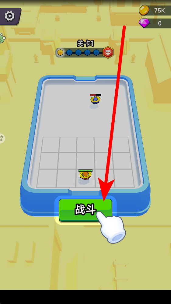 1、进入应用,在关卡界面点击战斗按钮,选择关卡1开启挑战,操控己方陀螺,利用场地空间,向敌方陀螺发起进攻,尝试碰撞击败对手。