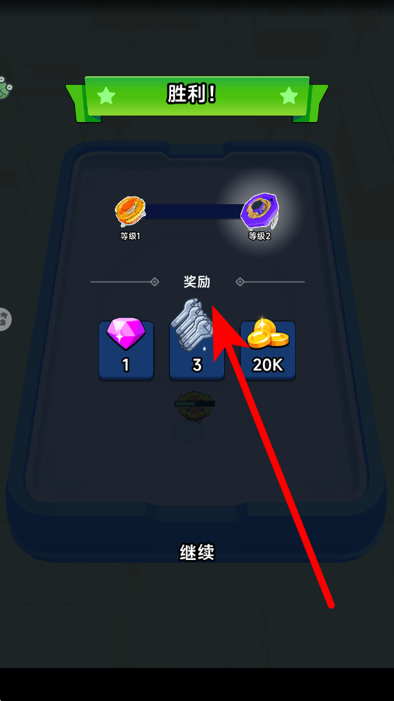 3、战斗胜利后,进入结算界面,可获取宝石、道具、金币等奖励,点击继续按钮,返回关卡选择,开启新挑战,用奖励强化陀螺,提升战力。