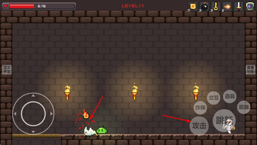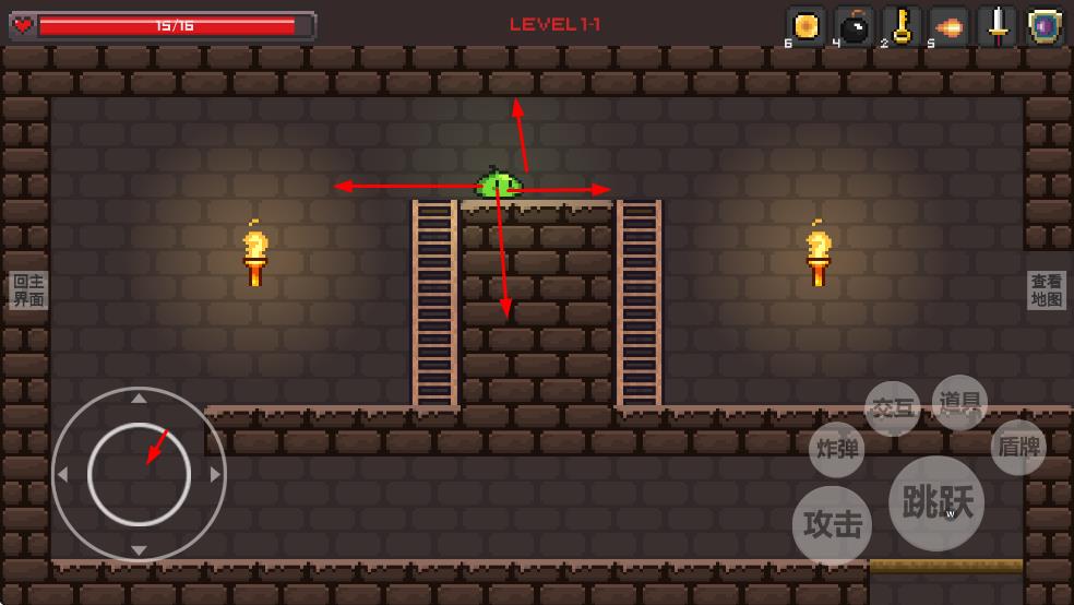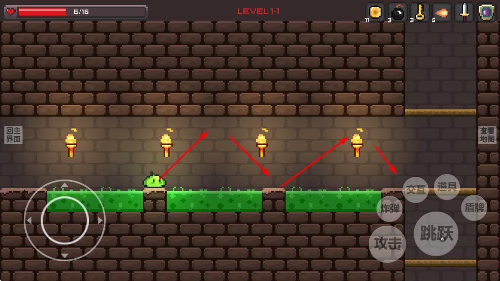 1、操控左侧摇杆移动角色,点击右侧跳跃跨越地形障碍,在LEVEL1-1地牢场景探索路径。