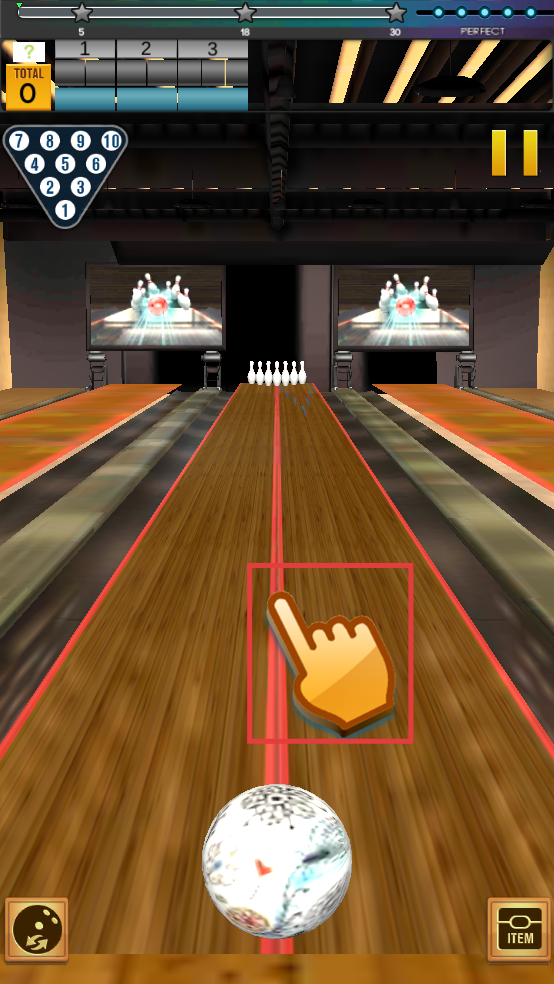 1、开局我们按照屏幕中手指指引位置,长按屏幕调整保龄球的发球位置,让球沿红色标线对准球瓶,松开手指发球。