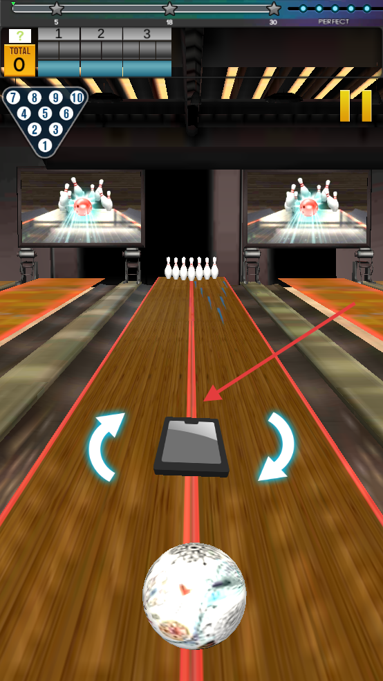 2、发球后,依据红色箭头提示,通过左右旋转屏幕中的黑色挡板,微调保龄球路径,助力球精准撞击更多球瓶。