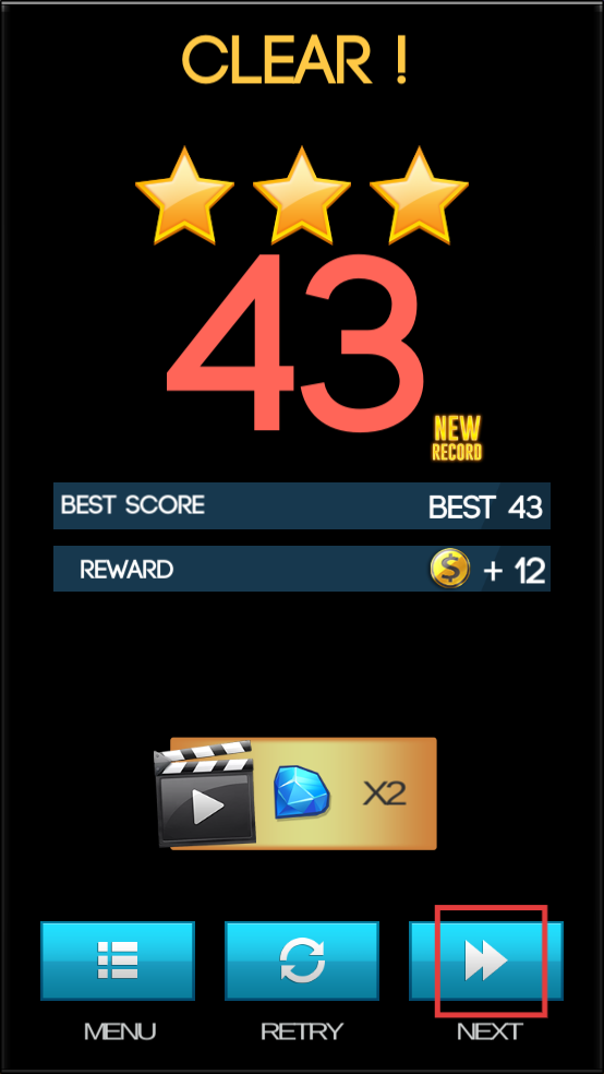 3、关卡结束,界面显示得分43、奖励12金币等,点击右下角蓝色NEXT按钮,进入下一关挑战新的保龄球赛道。