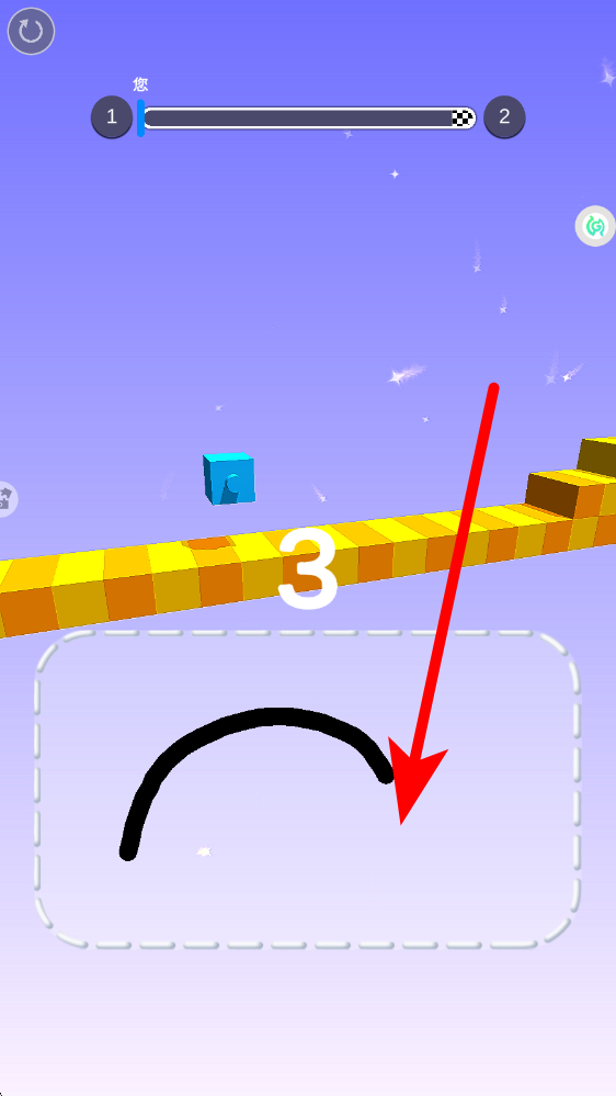 1、进入游戏,在赛道起始处,依据提示在绘图区绘制对应形状,为方块赋予前行助力,让方块借助绘制形状开启跑酷旅程,应对初始赛道挑战。