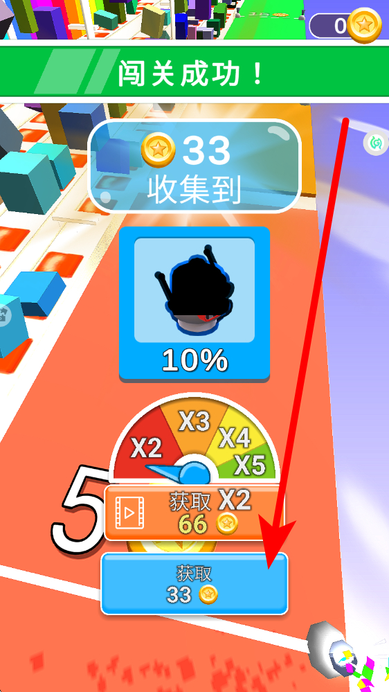 3、抵达终点后,进入结算界面,可获取收集的金币与道具奖励,依据闯关表现获得对应倍数加成,点击获取按钮领取奖励,为后续闯关积累资源。