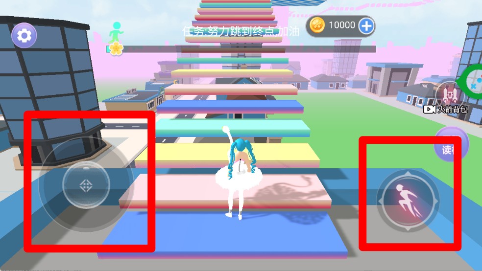 3.操作界面中左侧为虚拟移动摇杆右侧为冲刺按钮,需要灵活操控角色完成跳跃和奔跑,顺利跨越前方的彩色阶梯障碍。